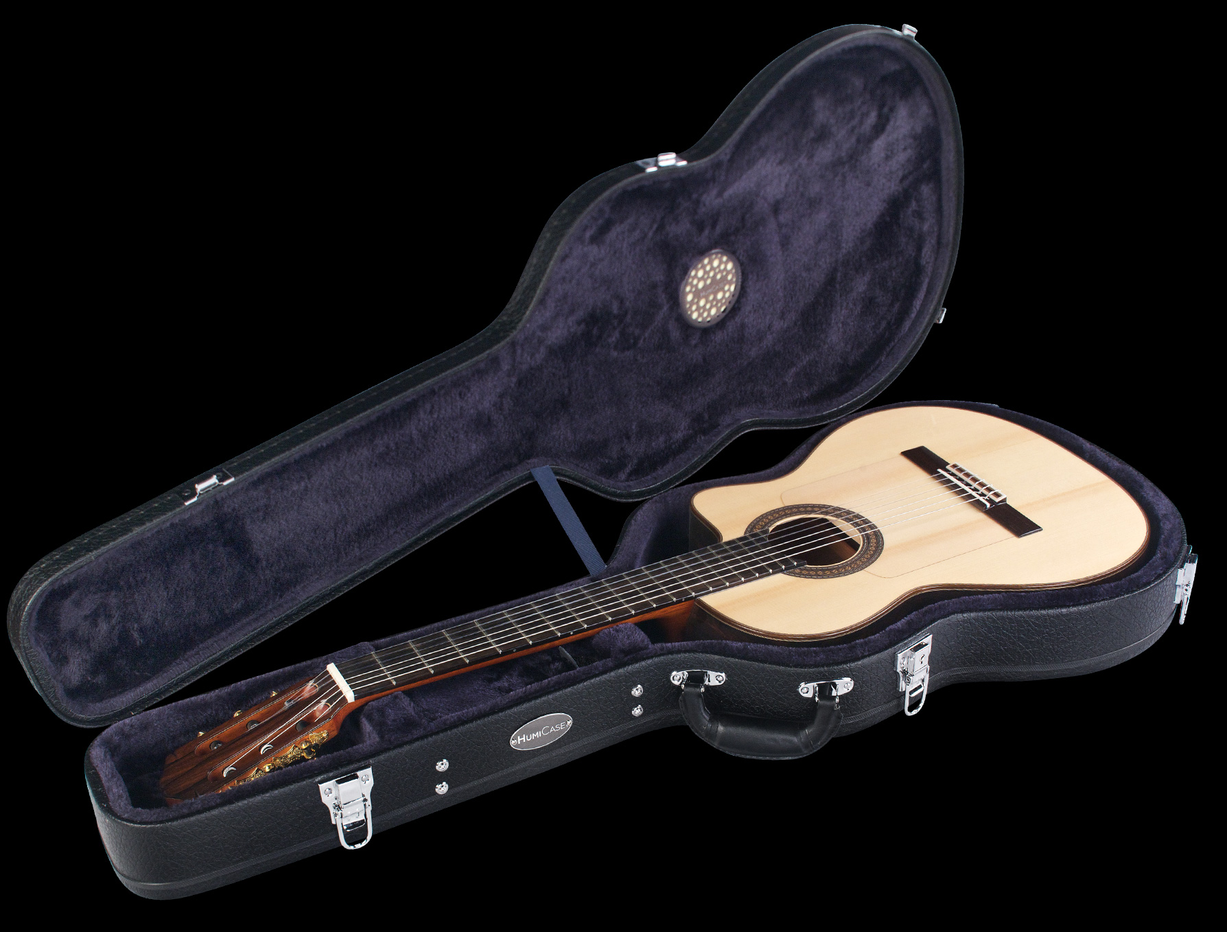 Arched top wood case with 7-ply construction. Deluxe locking chrome hardware, soft plush interior with storage compartment. Built in Humidification System. Classical/flamenco or Dreadnought size.